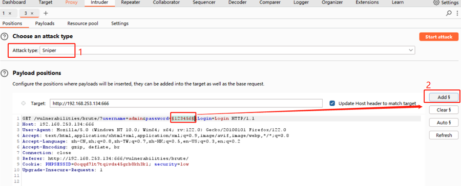 4、切换到Intruder,进行暴力攻击设置。Positions页面选择Attack type、选中需要暴力破解的密码字段,点击Add §。