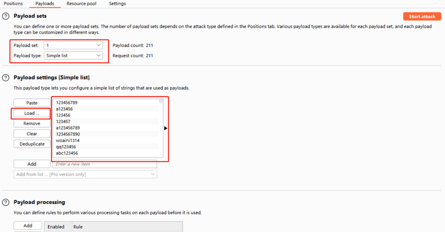 5、Payloads页面,负载默认1、负载类型选择Simple list;点击Load... 从本地选择密码字典文件。点击Start attack,开始暴力破解。这里会弹窗提示使用专业版本,功能会更全面。