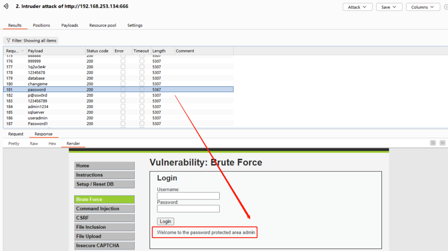 6、查看密码暴力破解结果,可以看到其中password这行,Length长度跟其他不一致;点击查看其返回结果,查看Render页面回显,提示"Welcom ....",说明password为正确密码,登录成功。