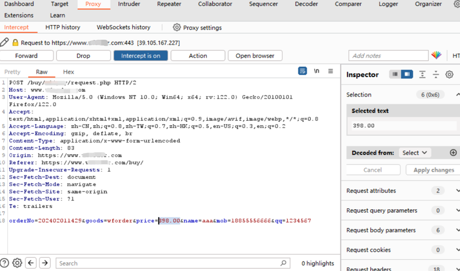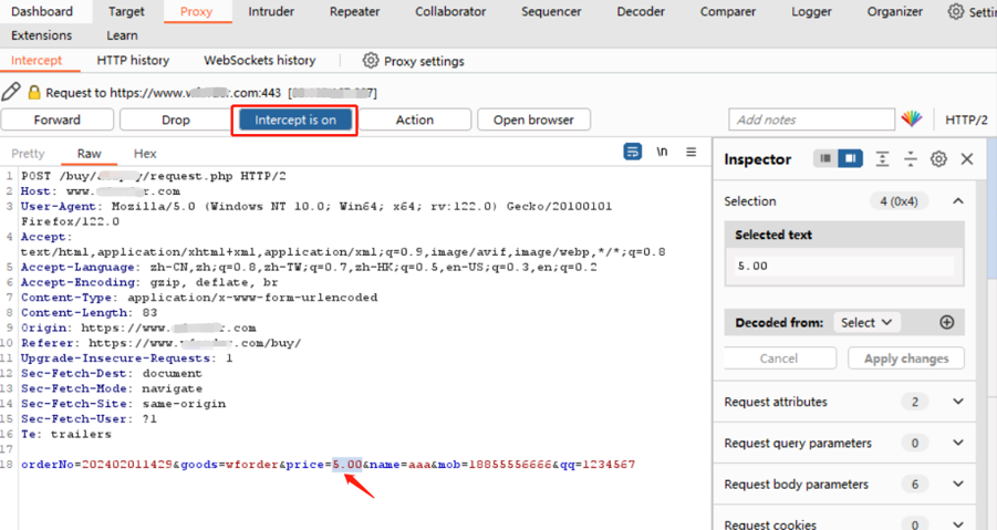 2、burpsuite中,进入Proxy->Intercept,点击Intercept is off,开启数据截获;再去支付界面点击“立即购买”。可以看到捕获数据如下: