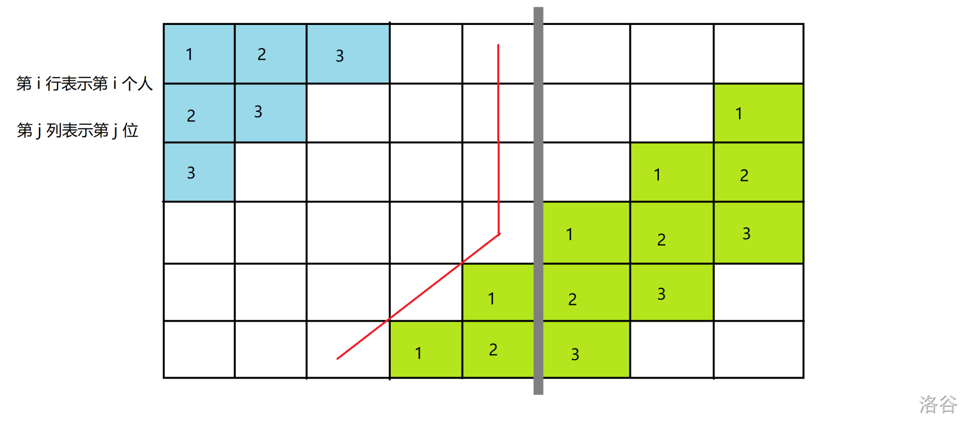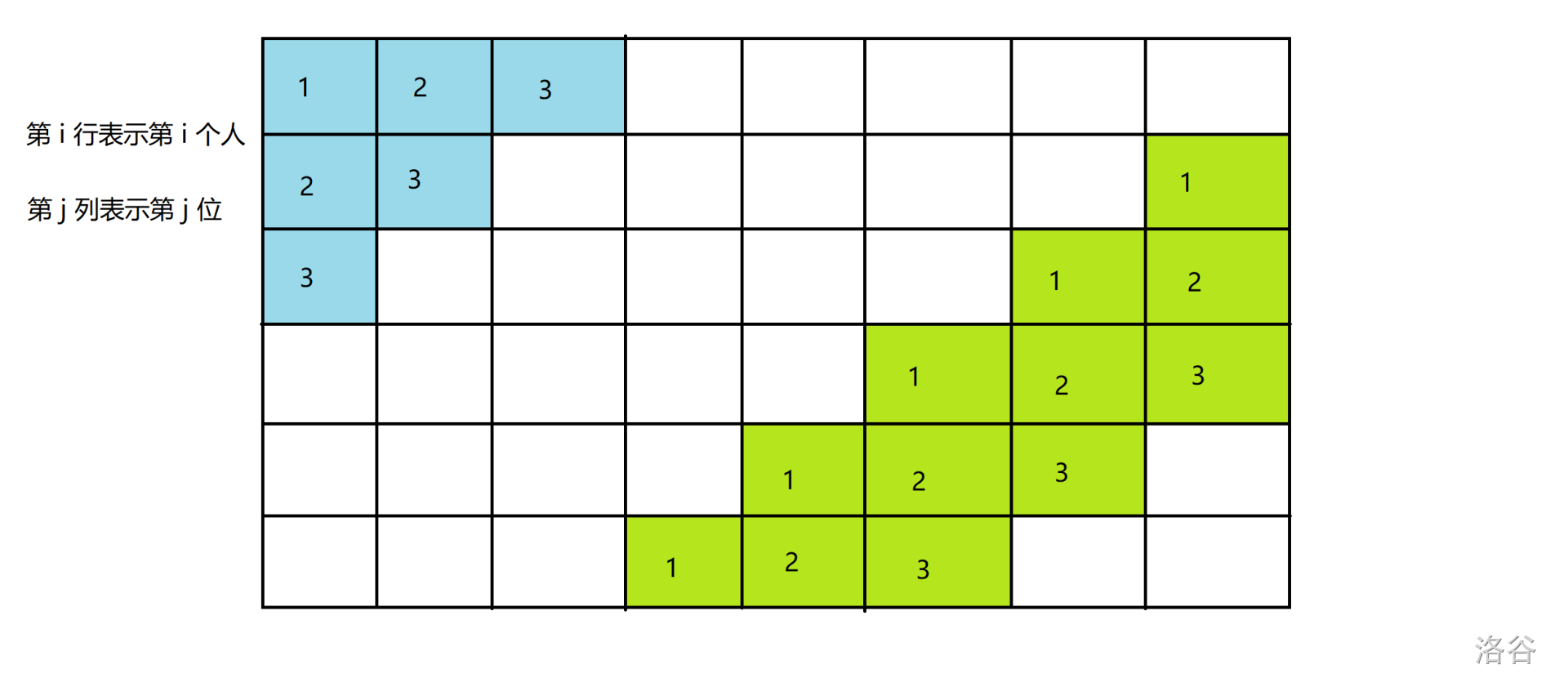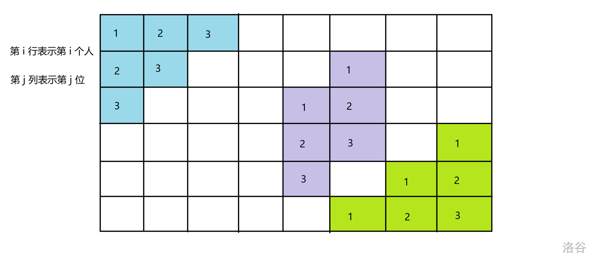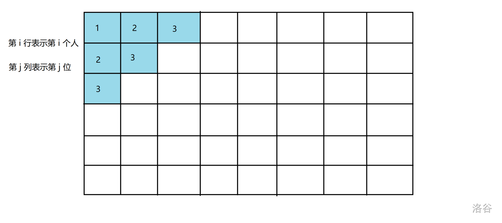 如图,浅蓝色区域确定了 \(b_{j,k}\),其中数字表示第几轮被确定。设第 \(r\) 轮被确定,则 \(j+k+1=r,k=r-j-1\)。