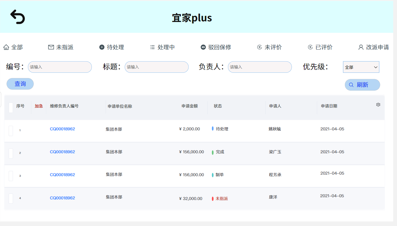 消费者:能够提交家电产品的维修申请,查看维修结果。