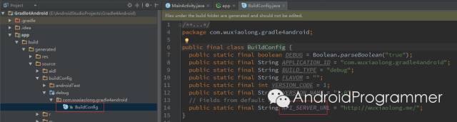 buildConfigField 一共有3个参数,第一个是数据类型,和Java的类型是对等的;第二个参数是常量名,这里是API_SERVER_URL;第三个参数就是你要配置的值。
