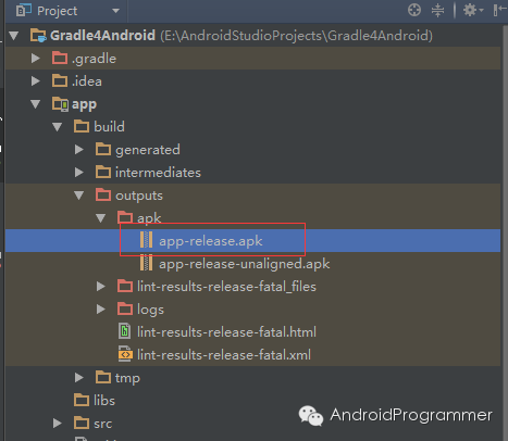 OK,打包成功的apk路径如:E:\AndroidStudioProjects\Gradle4Android\app\build\outputs\apk\app-release.apk
