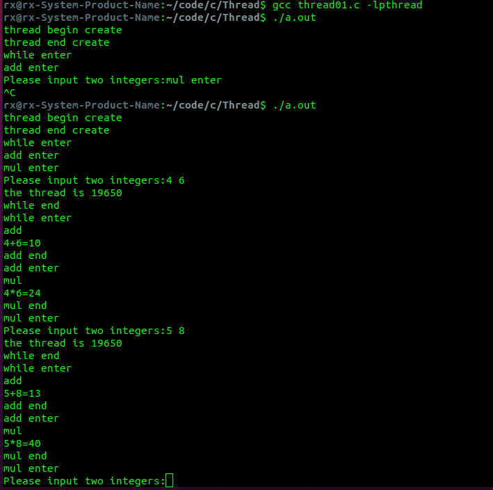 可以发现两次运行 while enter add enter mul enter 每次运行顺序是不一样的 这是因为一开始三个线程都是在运行状态 它们的运行顺序是由系统分配的 这就是为什么 需要用 wait 降低信号量来阻塞 这样就可以控制线程运行顺序
