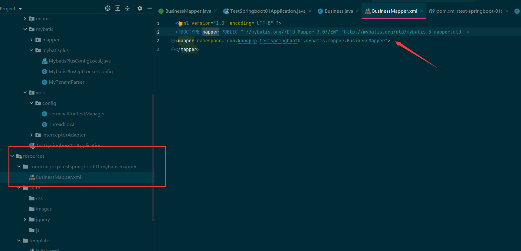 注意,resources中的文件夹地址和配置文件中要保持一致,xml中namespace地址注意和实体保持一致