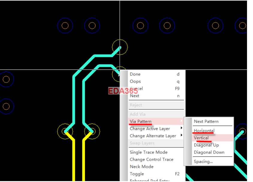走线时点击右键via pattern——horizontal(水平)——vertical(垂直)