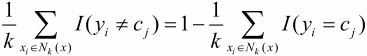 k近邻法中的分类决策规则往往是多数表决,如果分类的损失函数为0-1损失函数,对给定的实例x∊x,其最近邻的k个训练实例点构成集合Nk(x)。如果涵盖Nk(x)的区域的类别是cj,那么误分类率是: