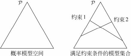 下图是用最大熵原理进行概率模型选择的几何解释。概率模型集合P可由左图的三角形表示。一个点代表一个模型,整三角形代表模型集合。右图上的一条直线对应于一个约束条件,直线的交集对应于满足所有约束条件的模型集合。一般地,这样的模型仍有无穷多个。学习的目的是在可能的模型集合中选择最优模型,而最大熵原理则给出最优模型选择的一个准则。