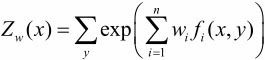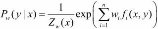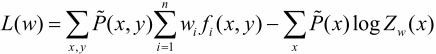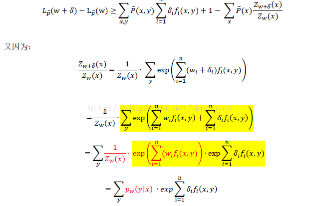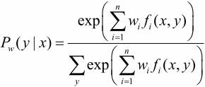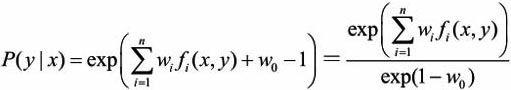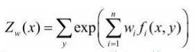 Zw(x)称为规范化因子;fi(X,Y)是特征函数;wi是特征的权值。上式表示的模型Pw=Pw(Y|X)就是最大熵模型。这里,w是最大熵模型中的参数向量。同时也可得出 Zw(x) = e(1-w0)