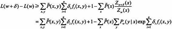 如果能找到适当的δ使下界A(δ|w)提高,那么对数似然函数也会提高。然而,δ是一个向量,含有多个变量,不易同时优化。IIS试图一次只优化其中一个变量δi,而固定其他变量δj,i≠j。