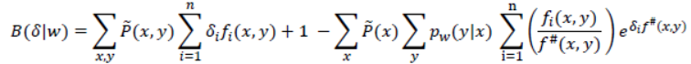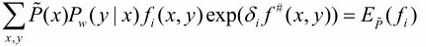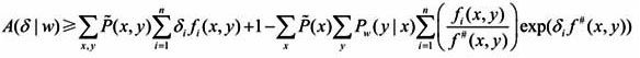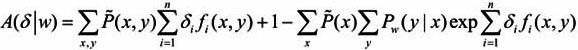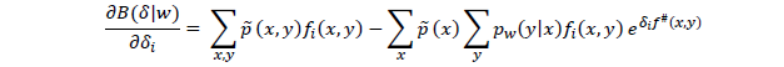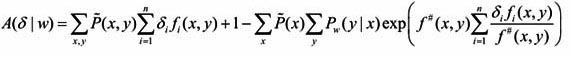 因为fi是二值函数,故f#(x,y)表示所有特征在(X,Y)出现的次数。这样,A(δ|w)可以改写为