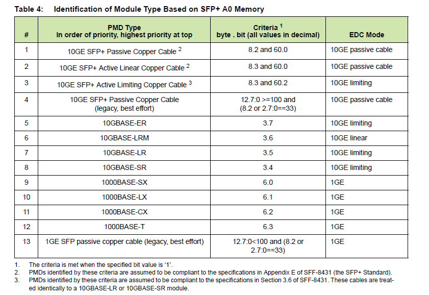 3、PHY通过读取光模块的A0内存来识别光模块类型,该内存会在光模块插拔或者重启之后进行读取。有一个特殊的bits用来决定模块类型和优先级顺序,如下表所示。