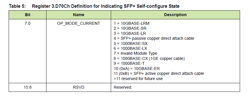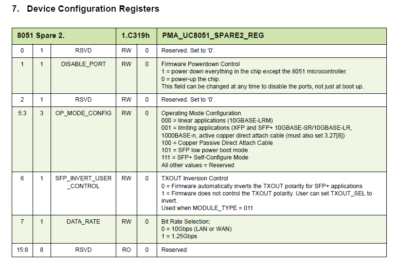 1、配置OP_MODE_CONFIG(位于Device Configuration Register)为0x7,这样就使得PHY处于SFP+的自行配置模式。在上电、重启或者热插拔事件发生时能够自动识别PHY的类型,并且配置PHY到正确的运行模式。Device Configuration Register的明细如下: