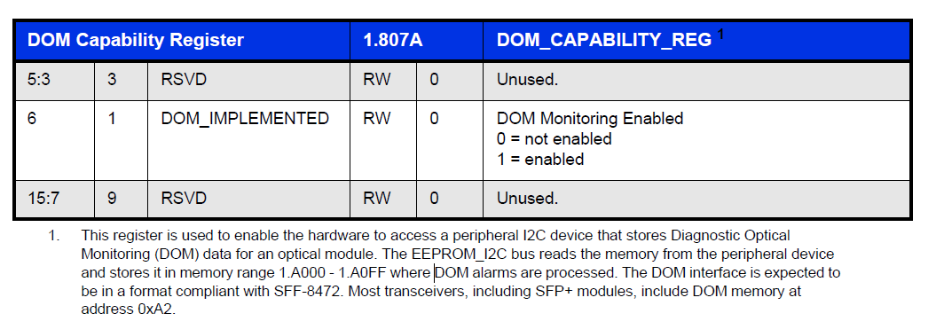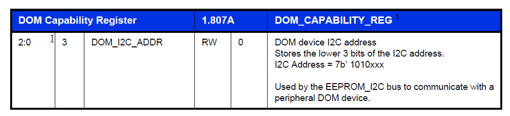 7、DOM_CAPABILITY_REG寄存器:该寄存器使能访问外围的I2C设备,该设备已经存储了诊断光学跟踪数据。寄存器说明如下:
