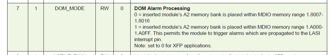 如果A2内存被存储在了1.A000~1.A0FF,光模块状态报告在寄存器1.A070~1.A071,此时该寄存器能够被用来通过寄存器1.9000~1.9007来驱动LASI中断。