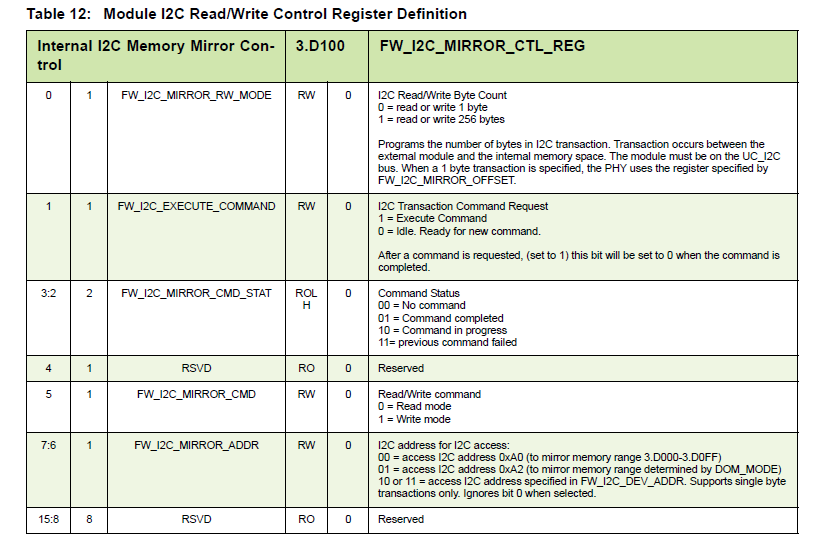 当固件处于acquisition或者tracking状态(UC_STATUS = 0x50或者UC_STATUS = 0x70),能够通过UC_i2C手动操作连接到A0或A2内存单元,此时需要设置FW_I2C_CTL_REG为3.D100。该功能被用来通过手动读取或写QT2025的A0或A2镜像内存修改光模块的特定字节。也能够通过QT2025的A0或A2镜像内存来读写光模块的256字节数据。FW_I2C_CTL_REG寄存器内容如下: