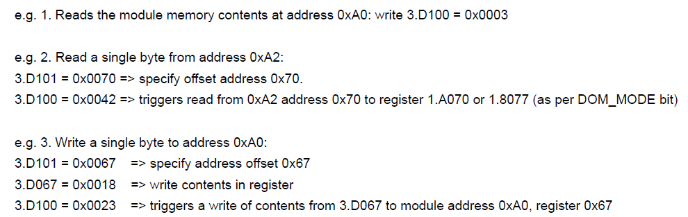 当进行单字节传输时,固件将使用FW_I2C_MIRROR_OFFSET中的特定地址。读操作时光模块寄存器内容的偏移和MDIO寄存器的偏移时相同的,写操作时MDIO寄存器内容的偏移地址指向光模块中相同的寄存器偏移。光模块的I2C读写偏移寄存器偏移如下: