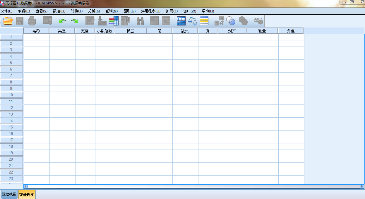 如上图,可以看出SPSS包括数据视图和变量视图,每一次操作,先从变量视图里面定义变量信息,定义好之后,就从数据视图里面显示出相关的定义的变量。