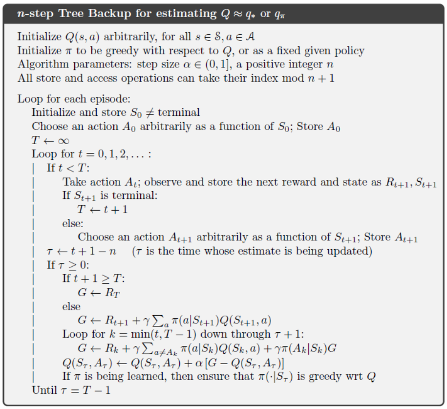 从伪代码中可以看出,整个算法有三层嵌套循环,有其在第三层循环中需要遍历每一层所有的动作,计算量相当大。树备份算法将一段轨迹的所有动作纳入考量,是TD算法与动态规划的结合,采用期望的方式估计目标状态价值,因此不需要引入重要性采样,同时也是一种离线策略算法。