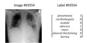 胸部X光片 :一张胸部X光片能够同时显示多种疾病,因此胸部X射线分类器也需要同时显示多种病征。下图为一张显示肺炎和脓肿的胸部X光片,在右侧的标签栏中有两个“1”: