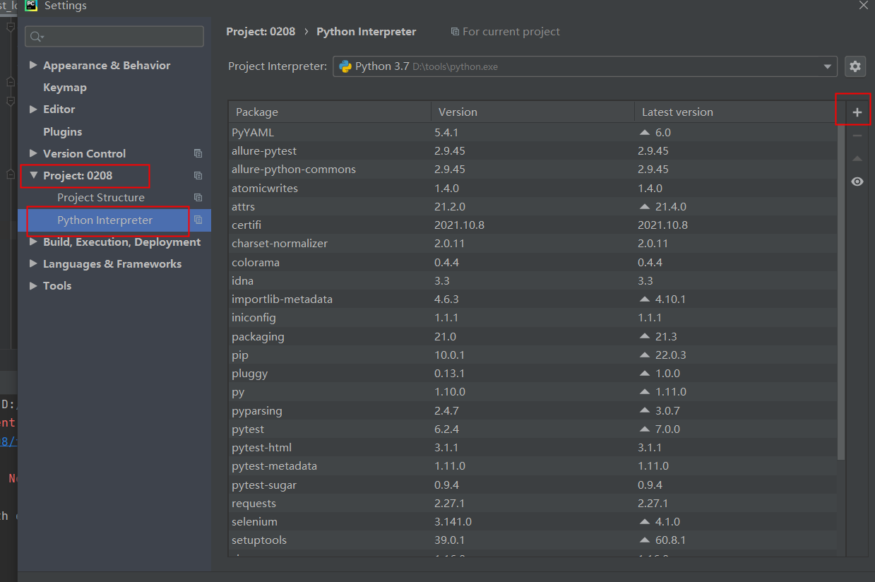 2.选择项目目录(如Project:0208)->Project Interpreter->点击右侧加号“+”