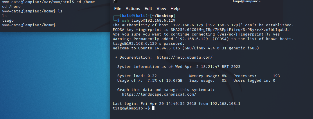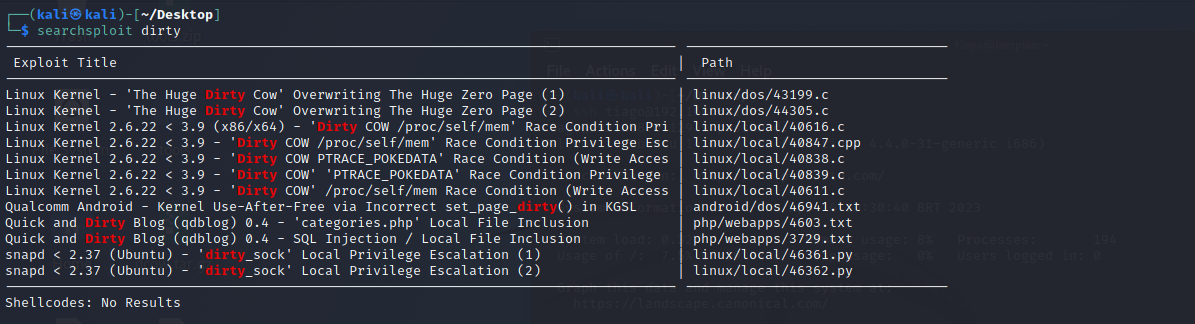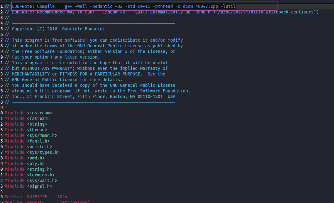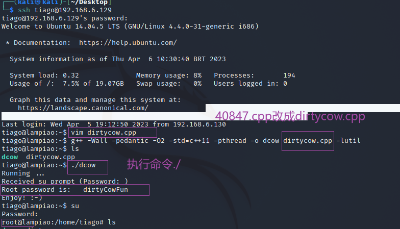 来到远程连接,上面已经知道用户名tiago和密码:Virgulino;vim 创建一个文件dirtycow.cpp,把上面复制的内容粘上,保存退出。然后将备份的那一行粘上,将40847.cpp改成刚创建的文件名,回车,root提权: