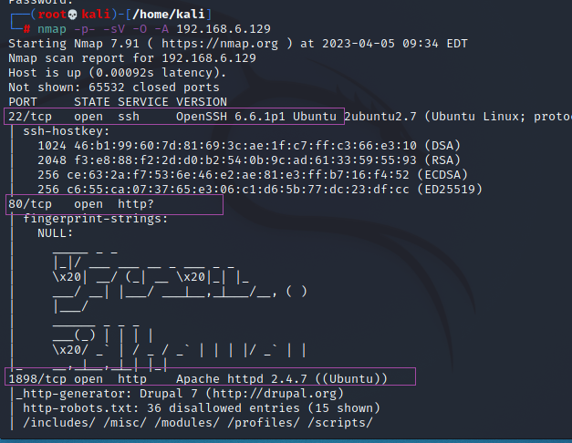 -p 扫描全端口,-sV 扫描端口对应的服务,-O 扫描靶机的系统版本,