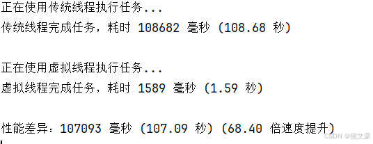 System.out.println("虚拟线程完成任务,耗时 " + formatTime(virtualTime));