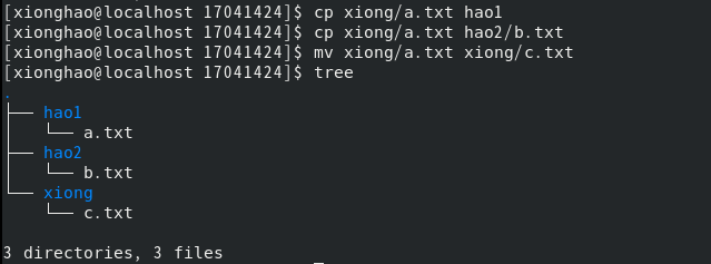 (7)把当前目录的第一个子目录中文件a.txt复制到第二个子目录中,然后再次把第一个子目录中的a.txt复制到第三个子目录并命名为b.txt,最后把第一个子目录中文件a.txt重命名为c.txt。通过tree命令查看当前目录情况。