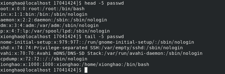(9) 用head查看passwd文件的前5行内容,用tail查看passwd文件的后5行内容
