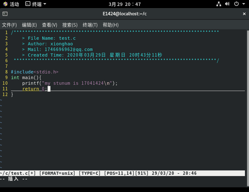 通过vim编辑器写一个C程序,功能为输出自己学号: