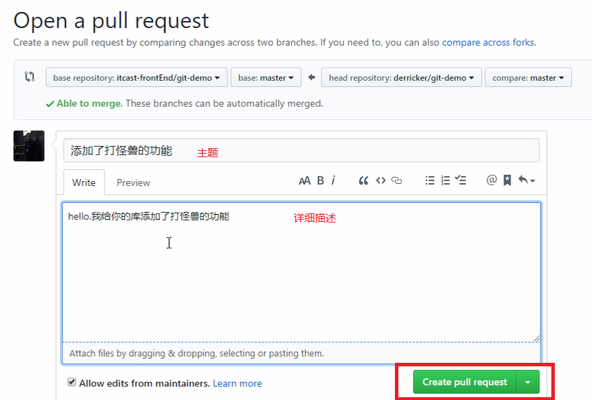 点击按钮会跳转到发送页面,填写主题和描述,点击create pull request即可,此时原作者就能收到信息