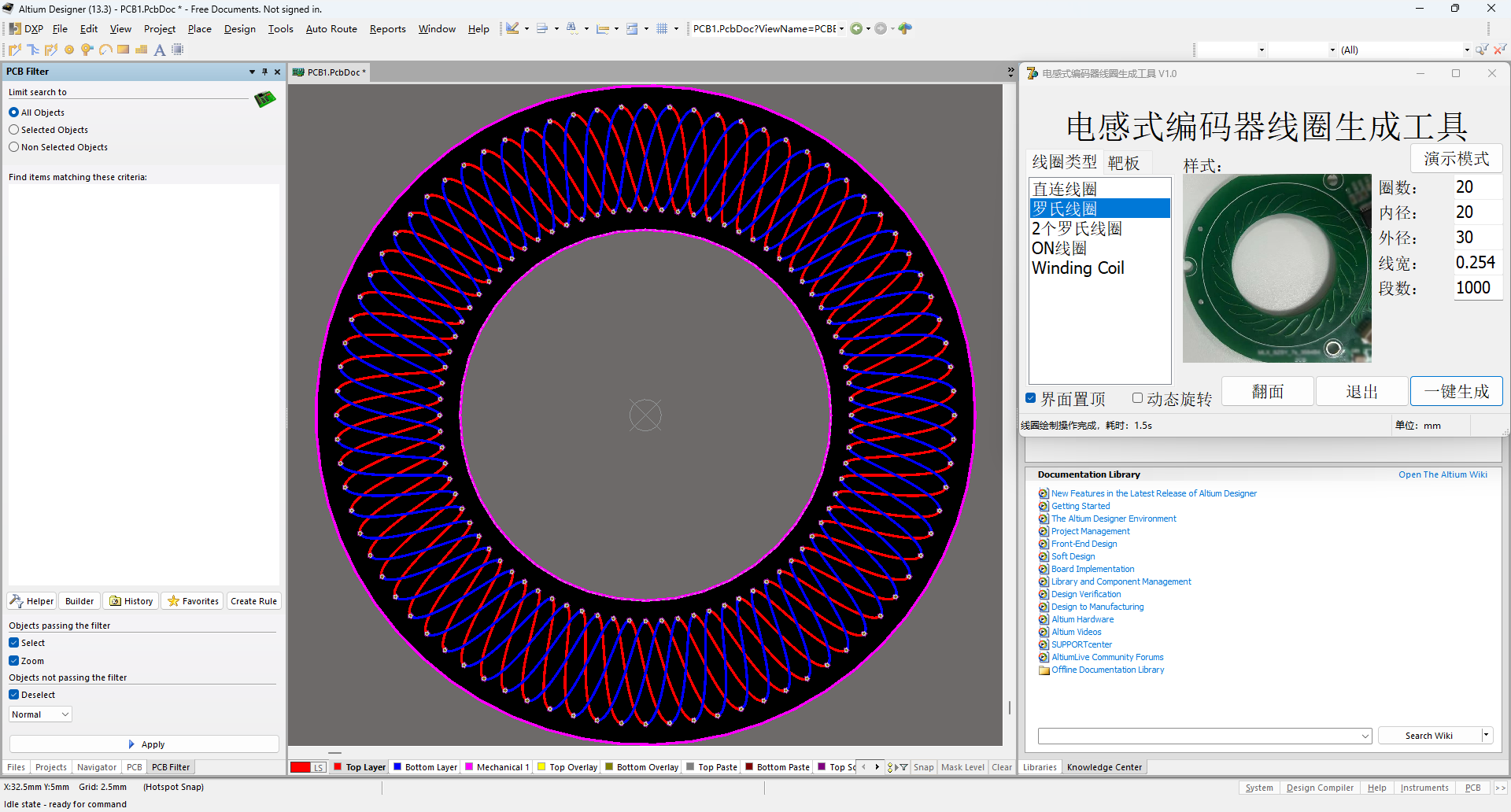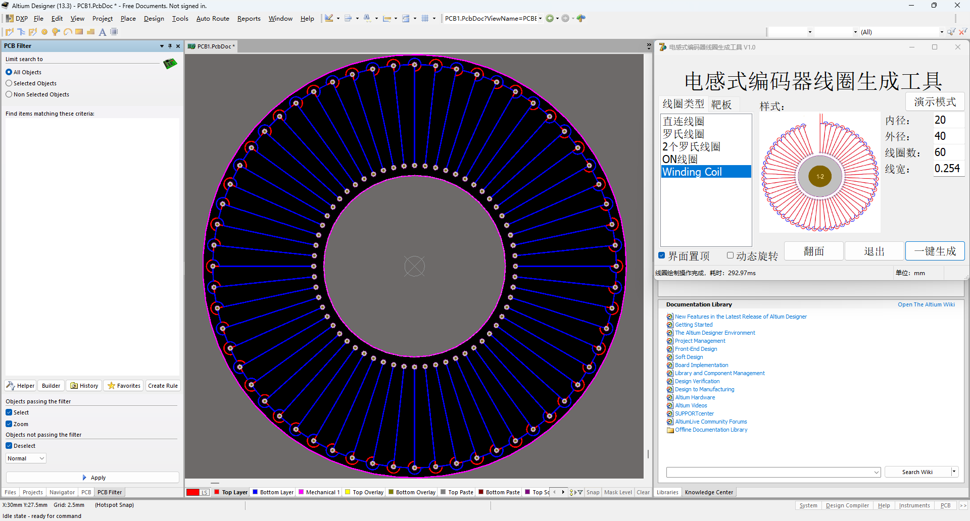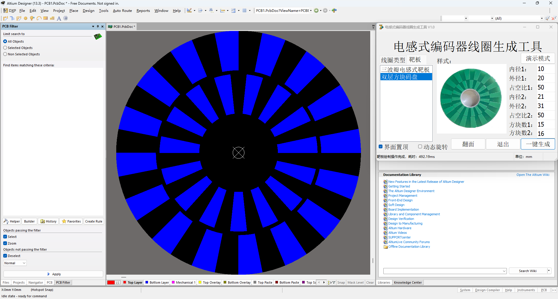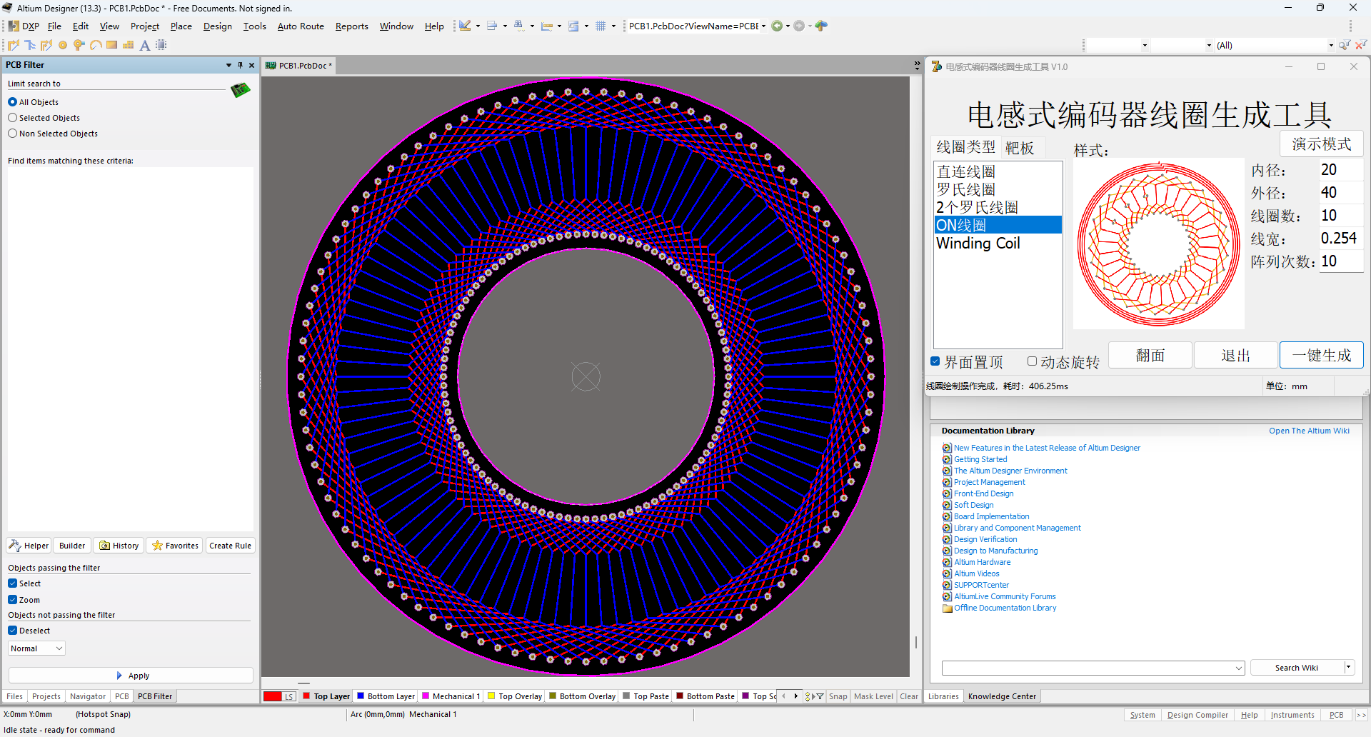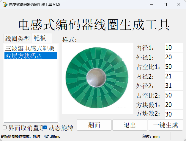电感式编码器线圈生成工具是一个参数化、一键生成电感式编码器线圈和靶瓣的工具。用于电感式编码器线圈设计中,支持线圈数量、线圈内径、线圈外径、线宽、段数自定义设置,可在百毫秒级的时间内快速的生成编码器线宽,生成的线圈需要手工将线连接出来,极大的提高了设计效率。
