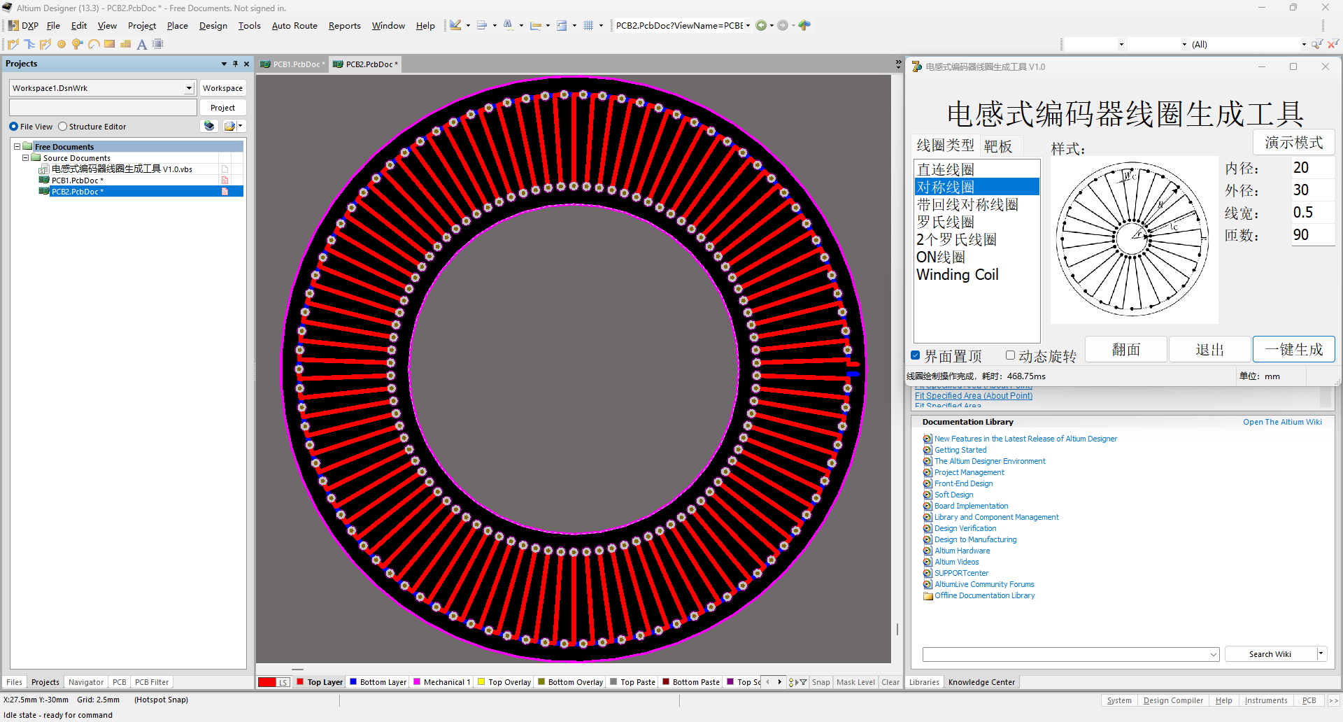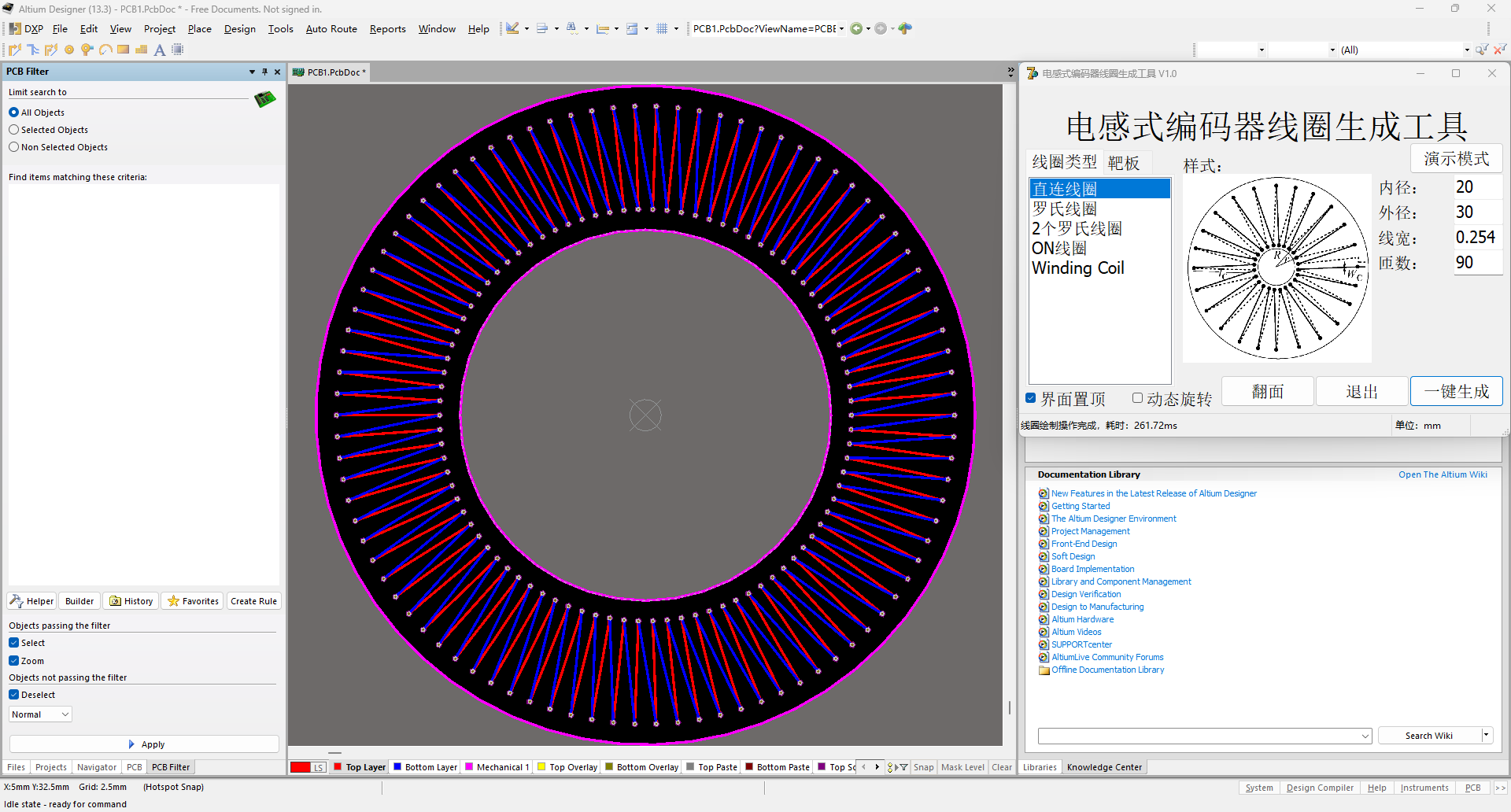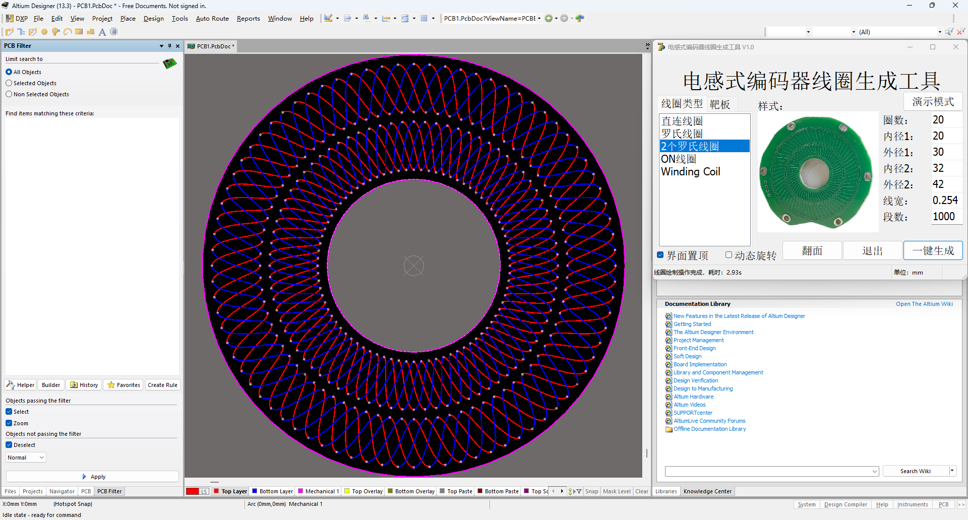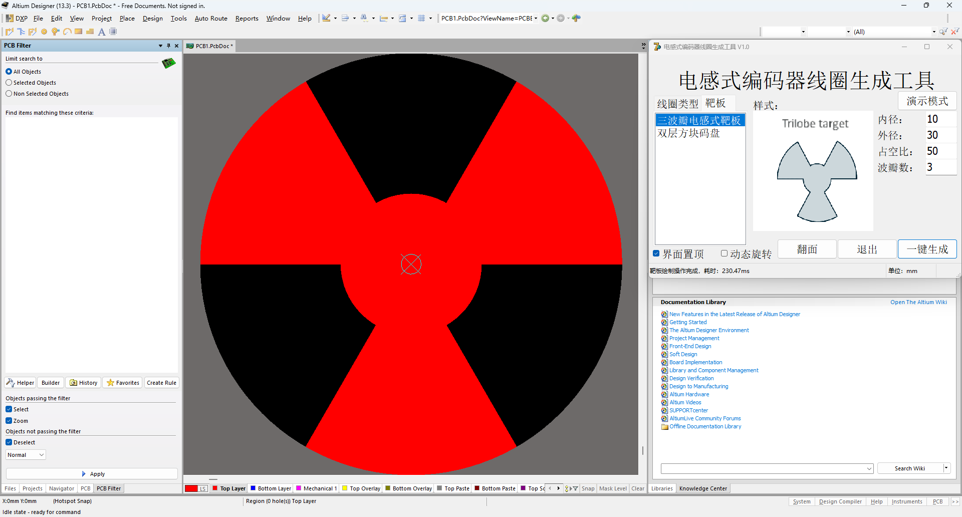电感式编码器线圈生成工具是一个参数化、一键生成电感式编码器线圈和靶瓣的工具。用于电感式编码器线圈设计中,支持线圈数量、线圈内径、线圈外径、线宽、段数自定义设置,可在百毫秒级的时间内快速的生成编码器线宽,生成的线圈需要手工将线连接出来,极大的提高了设计效率。