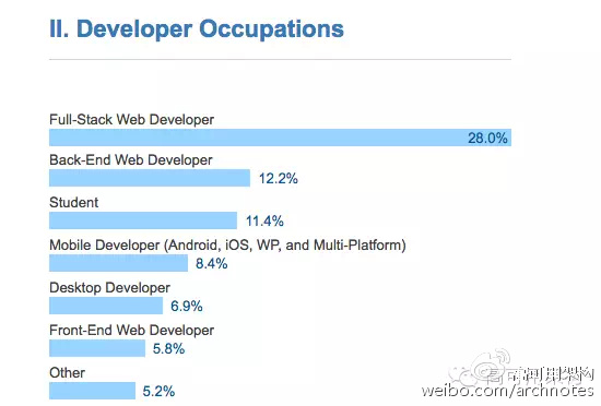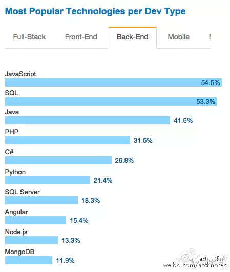 虽然 Node.js 在国内没有盛行,但据 StackOverflow 2016 年开发者调查,其中 Node.js 、全栈、JavaScript 相关的技术在多个领域(包括全栈、后端)都有排名领先。