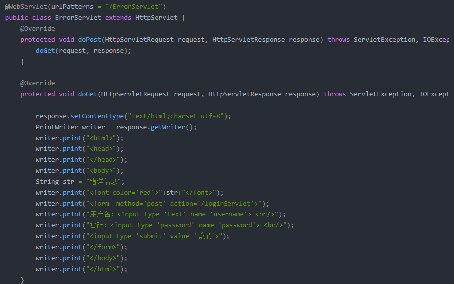在以前没有jsp的时候,若向前端呈现web内容,需要在servlet中拼接字符串(如下图,这项工作没有什么技术含量,是个体力活而且很容易导致程序错误),如果web内容拼接过多非常不利于web开发,所以就有了jsp,就可以理解为,jsp主要就是做字符串拼接的,在将.jsp编译为.class文件时,.class中的内容很多就是拼接的字符串,简单粗暴理解为:JSP=servlet+计算机拼拼接字符串。