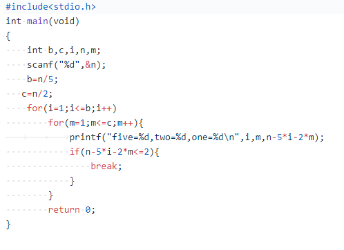 数据处理:表达式:for(five=1;five<=n/5;five++){for(two=1;two<=n/2;two++){for(one=1;one<=n;one++){if(one+two2+five5==n){printf()