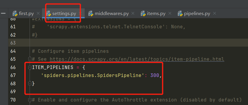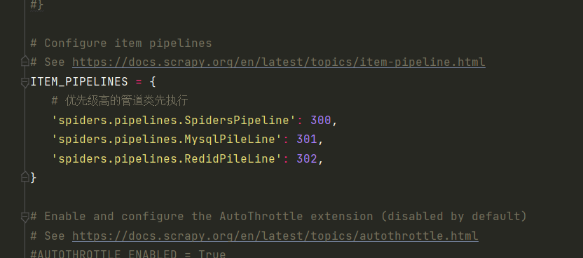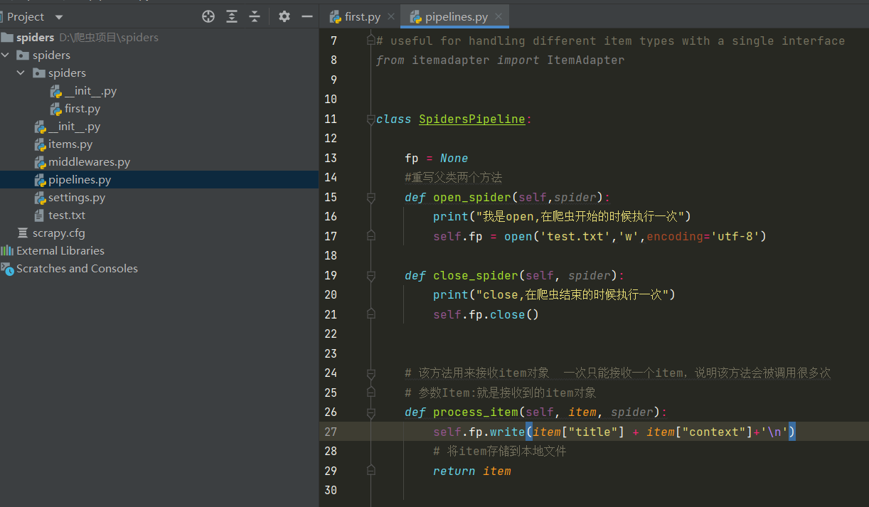 -在管道文件(pipelines.py)中,接收爬虫文件提交过来的Item类型对象,且对其进行任意形式的持久化操作