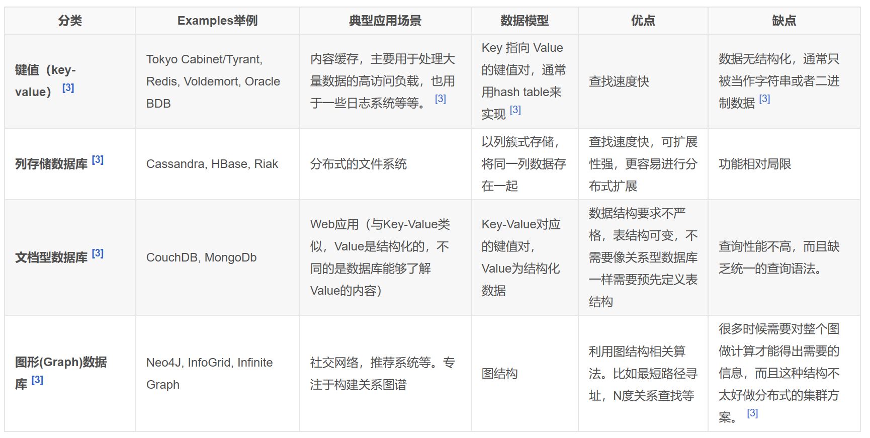 - NoSQL : 不仅仅是数据库、没有固定的查询语言、键值对存储、列存储、文档存储、图形数据库(社交关系)、最终一致性、CAP定理和BASE、高性能、高可用、高可扩......
