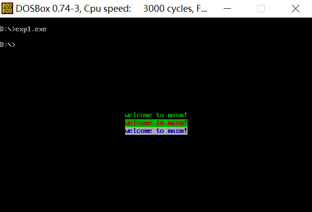 1 assume cs:code, ds:data, ss:stack 2 3 data segment 4 db 'welcome to masm!' 5 db 2h,24h,71h ;三行文字的颜色 6 data ends 7 8 stack segment 9 db 16 dup (0) 10 stack ends 11 12 code segment 13 start: 14 mov ax,data 15 mov ds,ax ;代码段的段始址送到ds 16 17 mov ax,stack 18 mov ss,ax 19 mov sp,16 ;栈段的栈顶指针指向ss:16 20 21 mov ax,0B87Ch ;将字符串显示在屏幕中间的位置 22 mov es,ax 23 24 mov cx,3 ;三行的显示代码是外层循环三次 25 mov bx,0 ;记录当前是第几行,也是外层循环的次数 26 27 s: push cx 28 mov cx,16 ;每行显示16个字符,内存循环16次 29 mov di,0 ;记录内存循环的次数 30 31 s0: mov al,ds:[di] ;低字节显示文字 32 mov ah,ds:[bx+16] ;高字节显示颜色属性 33 mov si,di 34 add si,si 35 mov es:[si],ax 36 inc di 37 loop s0 38 39 pop cx 40 mov ax,es 41 add ax,00ah ;切换到下一行的位置 42 mov es,ax 43 inc bx 44 loop s 45 46 mov ax,4c00h 47 int 21h 48 code ends 49 end start