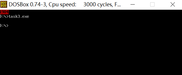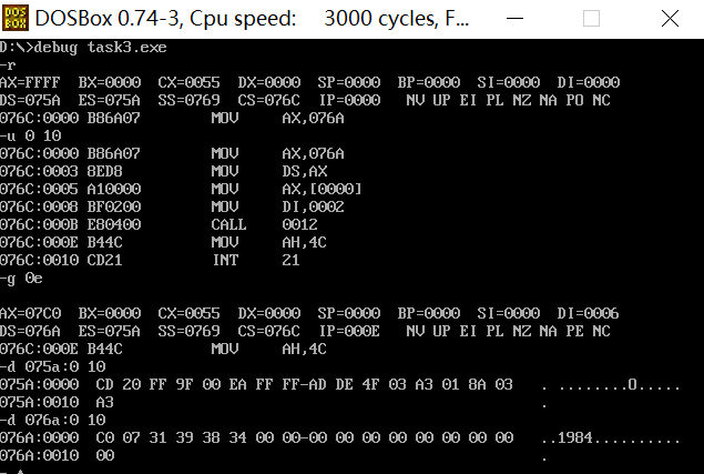 汇编,链接之后对该程序用u命令进行反汇编,用g命令执行到mov ah,4ch,用d命令查看执行之后的结果,发现把转换后的数字字符串'1984'存放在数据段中str标号后面的单元。