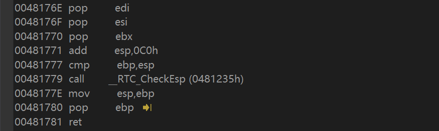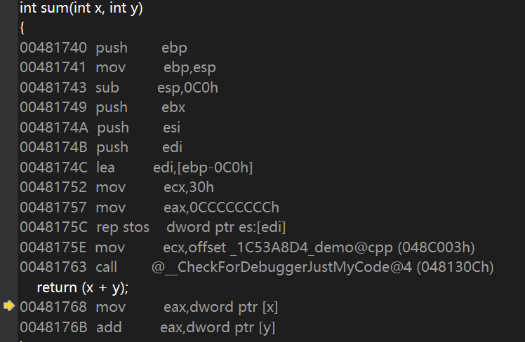 通过断点设置,查看反汇编代码,发现在c=sum(a,b)处的汇编指令先将b移到eax寄存器中,将eax压栈,将a移到ecx寄存器中,将ecx压栈,接着跳转到048116Dh处执行,并将此时的add esp,8的偏移地址压栈,被调函数也可以使用eax、edx、ecx这三个寄存器,所以规定调用者需保存eax、edx和ecx,在从被调函数返回后先恢复这三个寄存器的值再继续;被调用者保存ebx、esi和edi这三个寄存器,对他们进行压栈处理,执行完之后,进行出栈操作,遇到ret指令时,继续回到call指令的下一条指令执行。