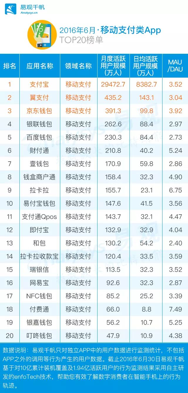 在C端移动支付类的APP中,不论是用户基数还是场景的丰富程度,支付宝是无可争议的领头羊,6月的移动支付榜单中,支付宝仍以绝对优势占据榜首,翼支付以435.2万人的月活数排名第二。
