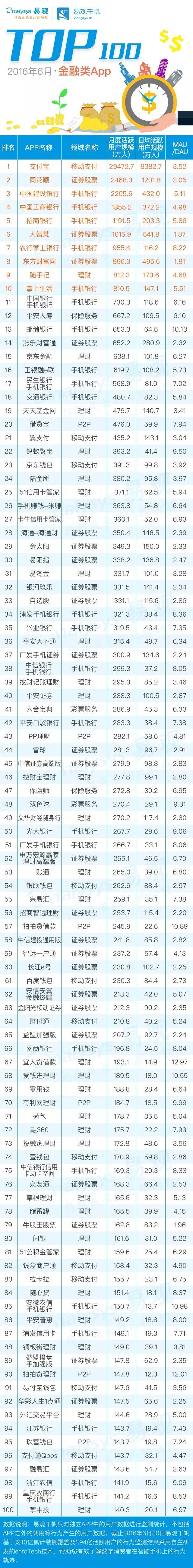 2016已悄然时过大半,金融各领域经过了开年大战,二季度末尾的6月更是几家欢喜几家愁,其中频繁出现的黑马更是足够让人惊喜。我们基于易观千帆6月移动应用大数据,筛选了百款金融类App为您揭晓TOP100大榜单!