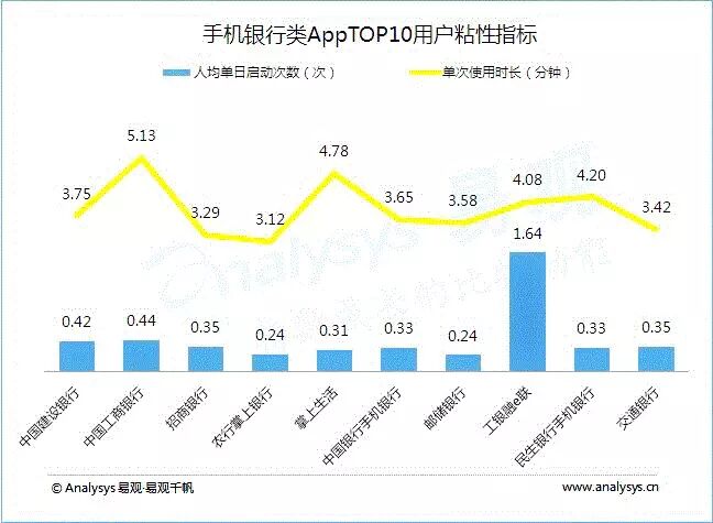 中国建设银行在移动端发力较早,线下用户的转化比例较高,近年来在用户规模上一直保持领先,但各商业银行与其的差距正在不断缩小。工商银行近年来不断加大对于网络金融的投入力度,推出“三融e支付”并在全行大力推广,其成果也在数据上直观的体现出来:在活跃用户数规模上缩小与建行差距,而于2015年推出的移动金融信息服务应用“融e联”也以619.7万人的月度活跃人数规模冲进榜单前十,人均单日启动次数也位列第一,达到了1.64次。