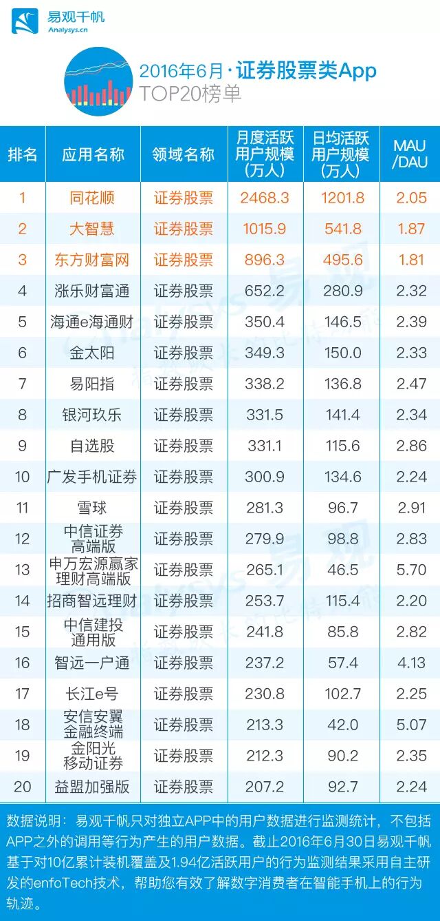 6月证券股票类APP榜单中,同花顺以2468.3万人的月度活跃用户规模排行首位,大智慧和东方财富网分别以1015.9和896.3万人的月活数排名榜单第二、三位。