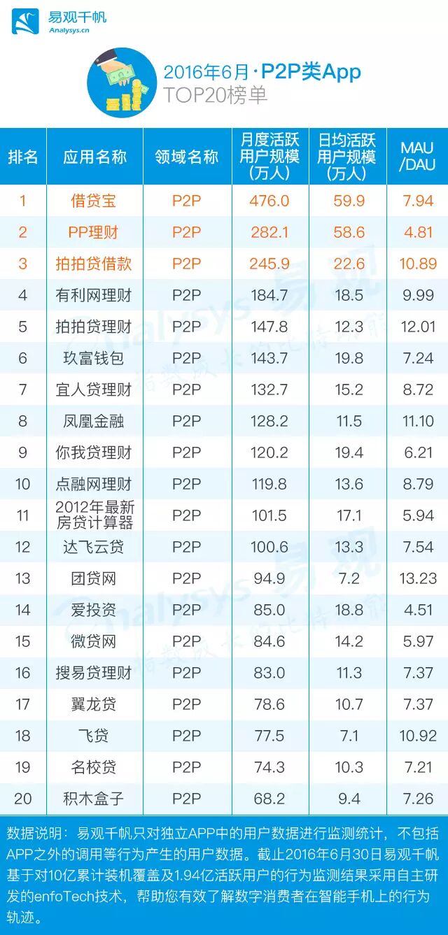P2P网贷企业在移动领域发力逐渐加大,借贷宝自去年经历千万用户量暴增后,截止6月其月活数稳定至476.0万人,依然位于网络信贷移动端榜单之首,其次为PP理财及拍拍贷借款,月活数分别为282.1万及245.9万,与第一差距较大。