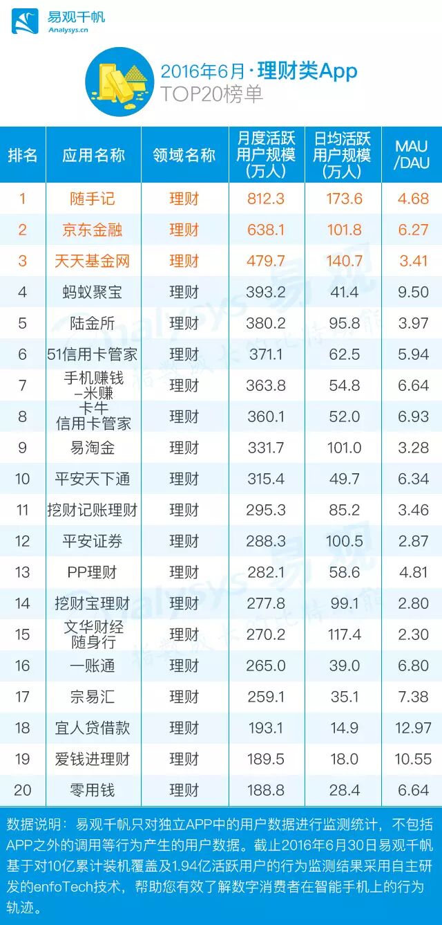 在6月的理财类APP榜单中,作为记账理财类应用的代表,随手记从早期单纯的记账应用到目前具备记账、账务分析、理财社区的综合理财应用,6月以812.3万的月度活跃用户规模排名首位,京东金融和天天基金网分别以638.1和479.7万人的月度活跃用户规模排名第二、三位。